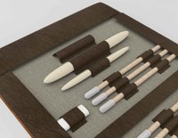 功能便携性速写笔袋(速写素描等绘画专业):将专用铅笔等绘画工具有序归纳和携带。同时将绘画纸张也可以得到保护和携带,使之不易折损弄脏。速写板也是绘画专业所必须的,面积过大,单独携带并不方便。设计一款配合速写板的笔袋也是项目的研究内容之一。使两者在携带时一体化,大大优化便利性。造价成本低,环保,人性化。