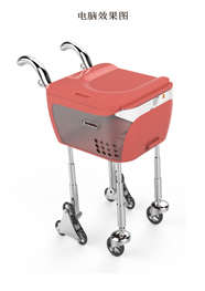 辅助功能定位:第一,购物车箱体大部分采用透明的材质,以方便老年人观看内部商品;第二,箱体部位有不规则的小孔,是为了让里面保持空气通畅,不至于产生异味;第三,箱体两侧有抠手,主要是为了遇到过高的地方,可以手提;第四,购物车本身装有拉杆,在上下楼时,可以将拉杆抽出,向上或向下进行拖拽;第五,购物车本身可以休息乘坐,盖子就是一个结实的座椅;最后,箱体前侧安有锂离子电池的灯,是一种手动开关所控制的,非常方便老年人在昏暗的地方推车行走。