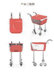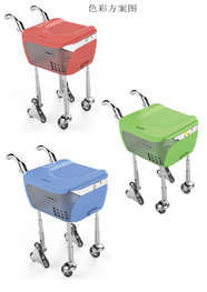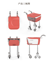 在造型上选用流线型曲面设计,避免了老年人因磕碰而受到的伤害,除了具有普通购物车的基本功能外,还另加了一些创新的小功能,比如,把手处的小挂钩、箱体的小灯、抽拉式的手杆等,非常方便老年人的使用,人性化的设计理念和人机工程学理论在产品上体现明显。