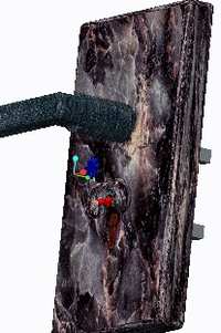 它看上去与普通门把手没什么区别,只是在锁孔的上方安有一排小灯,锁孔旁边是红外线感应器。当你的手扫过锁孔时,感应器就会向把手内部的单片机传送信号,由单片机控制小灯亮起,来帮你照明锁孔位置。