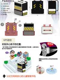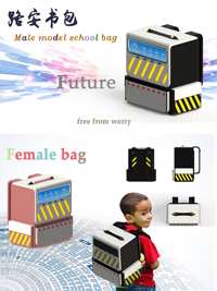 3、作品外观采用超轻材料,产品的主要功能有GPS定位方便家长更快速的找到孩子并接孩子回家,防水材料,与家长一键通话,绚丽反光条,多功能电子显示屏而且还能测量室外温度更有天气预报提示家长该带上雨伞或者增添衣物。后背是可调节背带,而且舒缓解压。