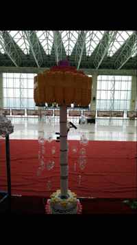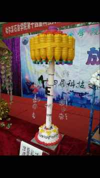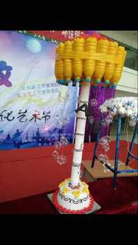我们以塑料瓶环绕的方式来代替灯罩,并把灯安置于内部,照亮时可先出层次感,并以此来散发出柔情的暖色,给人舒适的感觉。让人感受到家的温馨。并用废弃的拖布杆作为杆来支撑整个上端,而下部用盆及其木板和瓶盖作为底座,做到了物用至极的效果。
