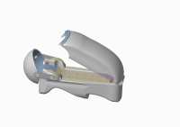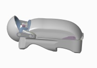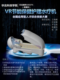 整体由上下箱体、面罩三部分构成。上箱体主要有旋转喷头、远红外灯结构、精油喷头;下箱体主要有按摩机构、气压箱、水箱、水源入口、电源装置、音乐控制结构等组成;面罩主要由VR视觉面罩、椰壳炭空气过滤面罩。