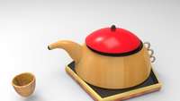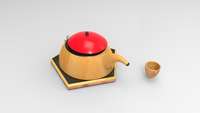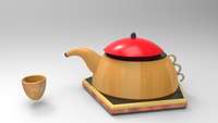 这是一款茶具,含有市面上茶具应有的功能,在其基础上涵盖了一些新的形式及功能。首先这款茶具有一个环形提手的设计,就是红色外壳顶部,看上去只是一个弧形的处理,但它连接了整体结构的两端,所以就能从上部提起,且比较稳定。壶神部分做了一个的处理,采用市场上普遍的半球体形状,壶嘴采用弧线形流线型,下面茶几使用无线电磁加热,仿照电子炉原理。这样能更好多加热,保持温度。能够更加满足饮茶人的需求。茶杯设计采用不倒翁原理,便于放置