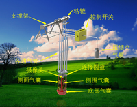 结构说明:装置由摄像头及照明灯引导部分、手动控制及传到部分、气囊托举围护及升井装置三部分组成。