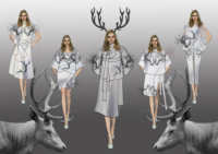 该系列的服装简约摩登,线条流畅而简单;运用黑白灰三色碰撞,产生纯净灵感,融入女性时尚;服装造型整体简约优雅,简单而不失单调。在服装用料上以无色系面料为主,采用双面皮革与钩花提边针织物面料;通过双面皮革的光亮质感来凸显女性的时尚气质,以及它特有的双面性来彰显女性的干练与柔美并存;辅以钩花提边针织物的肌理,来塑造现代女性优雅、知性的一面。除此之外,还运用了少量的线纱流苏做装饰,在优雅中又有一种灵动感;