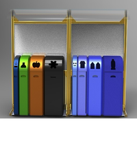 我们设计新型垃圾箱的的目的是为了宣传垃圾分类的理念,进而改变目前垃圾分类混乱的局面。我们主要将垃圾箱分成八类:金属类、废织物类、玻璃类、塑料类、有害物质、餐余、其它,并对应不同的颜色。首先,我们采用声光电的模式,每个箱体都设计了“发声装置”,如:塑料类,当路人投递时会说“感谢您投递塑料类垃圾箱”,给居民以教育。电池类垃圾桶上的小圆是用来装5号电池的,我们设计了一个装置,可以实现满5节电池发光,激励居民来投递。餐余类垃圾桶:首先开口处有红外感应,可以实现开口的开合,防止臭味散出;底部箱体设计成网格状,还有盛水的容器,可以将废水漏下。纸类垃圾箱的开口是笑脸的形状。