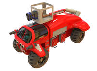 该消防车首都采用了圆滑的线条来设计外观,相比于已有的直线型消防车,圆滑的曲线更能符合人们眼球对机械美学的认知,车头部分使用了较为大面积的钢化玻璃材质,而且还拥有全玻璃制的上开气动门,在造型上更具有美感与科技感。功能方面为消防车添加了无人机设备,利用无人机设备进行空中火灾情况收集与火势分析,使消防员更全面的了解火灾情况并制定更加有效的灭火方案,提高了消防行动的工作质量,并且可以利用无人机携带灭火用品寻找最佳的灭火角度进行火源上的扑灭工作来实现空中灭火。
