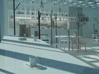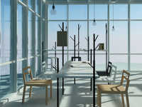 采用洁白色桌椅,没有过其他的颜色,使人沉静放松,在喧闹的城市紧张的神经得到片刻休息是多么惬意的事情。咖啡厅中间放置天然绿植大树,用通透的玻璃隔断,让人更好地直观感受绿色,感受自然。除此之外,可以说另个有特色的设计是桌边黑色的树枝造型的物体,放眼望去像一些不规则树枝,用作这么安静的洁白的环境中装饰并不跳跃,而且同时不能忽略它的功能性,可以当作衣架,挂物品袋的用途。简约而不简单。