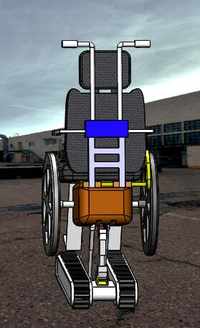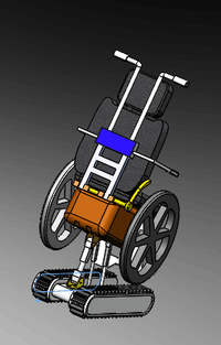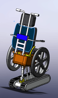 通过坦克可以跨越沟壑我们联想到可以利用履带来扩大轮椅的适用范围,使残疾人士在无人协助下即可使用轮椅上下楼梯。该轮椅同时兼具轮式机构和履带式机构,做到在平地时,我们用轮式机构代步;在爬楼梯或是跨越障碍时,履带机构下降,仅通过两者简单的转换,就大大扩大了残疾人使用轮椅的范围。