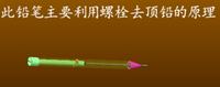 目前,在制图、书法、绘画行业都在大量使用木质铅笔,而大量木质铅笔的使用导致了大量木材的浪费。目前国内的自动铅笔只可以放0.5、0.7mm的铅,无法放2mm及以上的铅,其主要原因就是常规的自动铅笔如果放上2mm的铅一用力写字就会将铅顶上去无法将铅固定。而我设计的铅笔是利用螺栓去顶铅的原理,成功突破了无法将铅固定的难题,如果长期使用此铅笔,可为国家节省大量的木材。