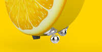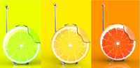 在整体外观部分,打破传统方方正正的造型,采用圆形作为主体,并借鉴水果切面的造型,分别提取了西柚、鲜橙、以及青柠的形态进行设计。在产品正面右上侧,将果汁从内而外渗出的流动形态,运用于拆分设计中。