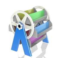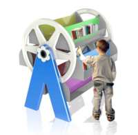 该产品采用摩天轮的旋转原理,将摩天轮的座舱设计为放书的书槽,而轮边缘则是旋转的把手。孩子通过拉动把手将需要的书转动到方便自己拿取的位置。每一个书槽有不同颜色的区分作为书籍的归类,将不同类型的书籍贴上相应颜色的标签,孩子自己便可将看完的书放回原来的位置。整个书架的结构是用多个板块组合拼装而成的,方便运输和使用。