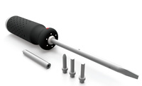完全便携式电动螺丝刀的先进性在于以开关便携、储备便携和造型便携为基础而使电动螺丝刀达到几近于完全便携的状态,运用光传感器、压力传感器、方向感应器便携式开关,解决了维修时死角的螺丝安装问题,让使用更加方便。螺丝刀杆可拆卸和组合,使携带和在一些狭小空间杆不够长的情况下更加便捷;LED照明灯解决了黑暗条件下安装时的照明问题;螺丝刀自身具备刀头库,使携带和储蓄更加简捷;在造型上将老式螺丝刀的造型和时尚颜色的搭配相结合,构造出一种美妙的艺术造型。