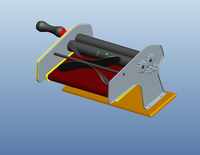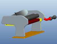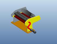 该家用饺子皮机有三对传动装置:轧面皮机构,轧饺子皮机构、传送带机构。其主要包括主动面辊、从动面辊、互相啮合的主动齿轮、从动齿轮、换向齿轮、传送带辊轴齿轮、偏心轴、饺子皮模具、支撑板、侧封盖、面辊盖、驱动手柄、传送带及与其配合的辊轴夹具等部件组成。家用饺子皮机一对压面辊与饺子皮模具并排平行分布,布局合理易于操作,轧面辊传动机构齿轮与传送带辊轴齿轮分布在同一侧,中间通过换向齿轮进行相互啮合,达到同步转动的目的,另一侧,压面辊轴有驱动手柄插孔,用同一个驱动手柄来操作,传送带位于压面辊与饺子皮模具的平行位置下方,留有可使面皮正常通过且易于压面的空间。这样使得结构比较紧凑,操作比较方便快捷。