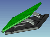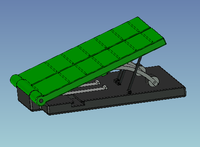 作为弹跳板和踏步踏板时,需将支承钢管放下,连接踏板和底板的销子拆下,将置于底板槽内的支撑杆取下支撑于底板和踏板相应的槽中,如图3踏板健身器工作原理图所示。支撑杆采用加粗高碳钢管,具有高强度、高硬度、高弹性极限和疲劳强度。踩踏踏板时,选用片弹簧,而非液压缸。因为液压缸随使用时间的延长会出现磨损、噪声等缺陷,并且造成成本上升。使用中片弹簧受压高度降低,滚轮可延底板向后滚动。弹簧不受力时高度为170mm,重80斤到200斤的人踩踏时,踏板边缘距底板高度分别为160mm-130mm。运动时没有冲击,不伤膝盖。