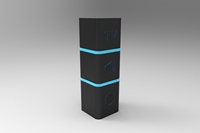 在按键上,省去了其他没用的键和数字键,只保留了三个重要的按键,换台和声音也有以前的两个变成了一个,通过左右旋转来达到换台的目的。三个键的顺序分别是从上到下频道,声音,开关,调节频道是最常用的按键,所以放在最容易触碰到的地方,而声音其次,放在中间,开关在最下面,保留以前的按键模式,不可以旋转,作为中轴。并且也由图标代替了以前的文字,对于那些不认字的老人来说也更加好辨识;图标变的很大,视力不好的老人也容易看见;图标的周围有一圈灯光的设计,在两个按键的过渡有也一圈灯光的设计即使是在大晚上,拿起遥控器他会发光,也不用担心老人看不见,指示灯设定在遥控器的头顶,不破坏遥控器的简洁美观性