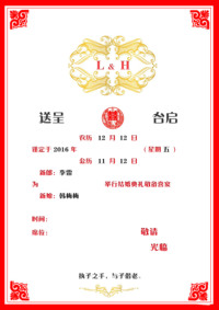 请柬主体靠流苏固定,请柬一共分为三页,正面反面和中间的请柬主体,请柬分为正反面两个。请柬的封面正面红色镶花,材质是牛皮纸,有一定厚度,中间设计出镂空的感觉,好像是里面的被印出来一样,反面也一样。内页就是邀请函啦,正反面都做了不同的设计。详情见效果图。设计灵感来自于传统风,对称设计,主题色调红色外加一些烫金花纹。四个角加入一些花纹元素,像是建筑的四个角,邀请函材质就是硬纸。“执子之手,与子偕老”作为婚姻爱的起点,象征爱情美好的归属。因为正反两面都有设计,也是为了方便大家的习惯,无论怎么拿放都不会受影响。当然呢,因为只有一角的固定设计,所以随意的旋转,360°毫无压力。很方便有木有?