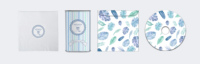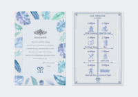 这是一套婚礼系列产品的设计,其中包括婚礼邀请函、婚礼流程卡、信封、光盘、光盘封面、餐巾纸和喜糖包装的设计。设计整体采用了西式的风格,外观简洁大方,清新脱俗。颜色上大多采用了淡紫色、淡蓝色,充满了甜蜜的气息。图案上则采用了树叶、小鸟、花环等图案,造型简约美观,低调典雅,符合当下大众的审美。