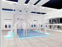 从色彩和造型上都能体现洁净,自然舒适的设计理念。空间设计以白色调为主,蓝色和绿色作为辅助,防止空间色调过冷加入部分暖色进行点缀。用点线面结合的表现形式进行造型,用象征隐喻的手法打造空间,意在表现品牌清新时尚,优雅的特性。发光灯带、筒灯、射灯、吊灯等光源为空间增添艺术效果。