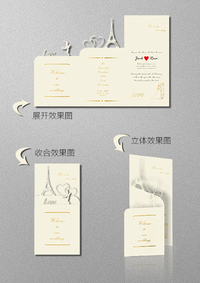 请柬制作的灵感来自男女从开始的相遇、相识,到渐进的相知,进阶的相恋,最后步入婚礼殿堂的相伴,一起生活,组建圆满家庭。请柬的结构为三折页结构,外页和中页上右镂空花纹,分别是人物剪影和象征爱情的埃菲尔铁塔。不同的页面上展示的高低落差体现了视觉感受中的近大远小特点,配饰以爱心镂空花纹,表达了热恋男女在埃菲尔铁塔下的甜蜜爱情。请柬的外页上为烫金的“welcome to our wedding ”直接的传达给人们婚礼请柬的主观信息。中页印以“Met Acquainted Understood Liked Loved And marry, Only little drops to our hearts”英文单词以竖向排列,将首页上的热恋情侣与底页上的婚礼中男女剪影相对应,表达了爱情进化的过程。底页上为婚礼主要信息,包括礼话、男女姓名、婚宴地点时间,且以一个红色爱心将男女双方的名字连接,让人的视觉中心转移,将主题表达.