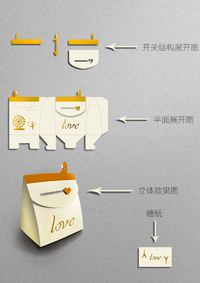 喜糖糖盒主要由糖盒主体和糖盒开关组成,糖盒的主体正面为logo和半页的开关,背面则为烫金的摩天轮和情侣剪影组成。开关的外观是婚礼男女的剪影,而男士与女士是分开的两部分,女士下方连接着一个爱心,打开糖盒需要将爱心拖移至另一边,女士也跟着爱心移动到男士身边,这样才能打开糖盒