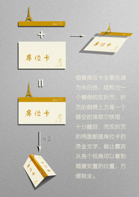 婚宴席位卡主要色调为米白色,结构为一个横倒的双折页,折页的侧楞上方是一个镂空的埃菲尔铁塔,十分醒目,而双折页的两面都是席位卡的烫金文字,能让嘉宾从各个视角可以看到婚宴安置的位置,方便就坐。