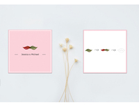 请柬的Logo来源于一片叶子,我们都是茫茫人海中的一片叶子,不停地生长不停地飘荡去寻找另一片叶子,直到找到与你合适的那一片才会拥抱亲吻,合二为一,一个亲吻的嘴巴的形状便由此产生。另外,叶子的形态具有流动感,上善若水,美好的爱情都是细水长流的,又给人一种见到喜欢人的欢欣鼓舞的感觉,红色与绿色象征男士与女士。