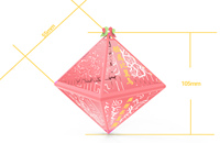 独立糖盒的设计:糖盒设计的色彩主要以“赤”为主,用黄色、“青”作为点缀。糖盒的设计元素在比翼鸟的基础上,融合了中国传统的灯笼和镂空剪纸的艺术。采用灯笼为原型,灯笼顶部悬挂的细绳也方便了人们的携带拿取。在此基础上,采用镂空的工艺进行改变。用中国传统的纹理进行分割,让糖盒整体看起来更为精致。糖盒的下部可以拆开,把喜糖拿出来以后,可以重新叠起来,把小小的糖盒在家里挂起来,作为装饰品二次利用。让婚礼美好的氛围长久保持,同时也提高了资源的利用率,一举两得。糖盒设计的色彩主要以“赤”为主,用黄色、“青”作为点缀。
