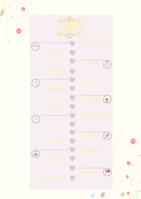 结婚流程单的设计有结婚请柬里的一些元素,还有一些和爱情婚礼有关的元素例如爱心,随着爱心的传递婚礼逐渐进行下去,除了一些文字对婚礼的介绍还有一些婚礼流程图标的表达,图标更生动明了的表达婚礼的进程,是婚礼变的更加形象化、,增添了婚礼的设计感和乐趣。有了结婚流程单就可以方便结婚程序的正常运行让观众更了解婚礼,方便婚礼更顺利的进行。是婚礼更加完美。