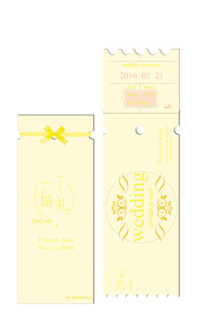结婚请柬的设计的灵感来自门票,所以设计的门票形式的请柬,一些重要时间、地点等信息位于最右边,重要信息为了吸引注意力,在最右边设计成了一个可折叠的面,这样就可以竖立起来注意到一些重要信息。比一些普通婚礼请柬的文化增加了乐趣,放置起来更加有趣。除此之外,左边一些吉祥纹样,表达了对婚礼和爱情的祝福。