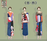 第三款服装给人的感觉是年轻充满活力的感觉,款式整体给人感觉简单大方,适合任何年龄段的人群穿着。主要表现为无袖型衫色块的拼接,有层次感,又使服装整体更为多元化。上半部分整体上采用大面积的不同色块拼接。整体造型活泼动感,适合秋季穿着。下装为一条宽松裙,运用复合锻料,上面印有彝族元素的抽象图案,寓意着年轻、活力、青春。裙子左边为一个褶的造型,与国际流行趋势接轨。服装给人一种休闲、年轻、活力又时尚的感觉。整体的款式、色彩、面料、图案都与前几款中相辅相成,使整个设计更具系列感。