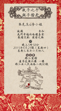 再附上新人中式结婚的照片,简洁明了“我们结婚啦”。与现代潮流新中式婚礼市场现状结合,满足消费者的“个性定制”,在保留喜帖的基础功能,交代婚礼时间,地点之余,更人性化标注出地图及活动安排。
