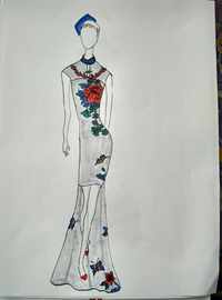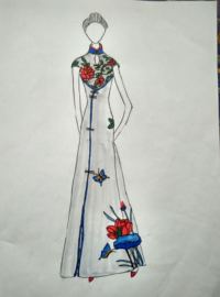 这个系列的服装简约而不失潮流,线条流畅简单;带有现代元素,有充分体现旗袍的本色。服装整体简单优雅大方,简单又不失于单调,尽显旗袍之韵味;还表现了服装的经典之美,重现旗袍的风采。这个系列主要设计的是礼服,看似简单的设计它的设计重点在于运用了中国传统的服装—旗袍加之改良,且加入了现代元素,还有图案的设计已是这个系列服装设计关注的一个重点构成部分。服装的整体感觉给人一种古典优雅之韵味,局部的设计又给人的视觉上又带来一种不一样的冲击尽显自然之美。这个服装运用多种手段来达到服装的和谐与完美。
