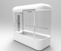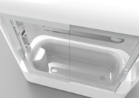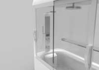 该产品将淋浴和浴盆结合成一个整体浴房的形态,考虑到老年人在洗浴的过程中可能会出现的问题,从而设置了淋浴凳、助起扶手等装置,产品顶部花洒可调节,根据使用情况左右倾斜;背喷花洒起到一定的按摩作用;产品有恒温调控功能,呼救报警器可供老年人在使用的过程中碰到紧急情况联系他人。