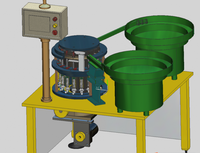 通过分拣单元把需要组装的部件分别倒入放置在振动盘内,通过振动盘的震动,工件会以水平摆放的姿势逐步通过振动盘边缘轨道,缓慢向上叠加,直至送料口,并进入送料及固定单元,部件通过送料及固定单元,各自进入上、下两个送料槽板中,其中,下部是固定和运送产品紧固件的,上部则是固定和运送洗发水瓶盖,运送过程通过凸轮分割器做回转运动精确传送到定位凹槽中。然后送料槽板在旋转过程中,按压单元中的顶杆因其底部为滑轮结构,可沿着凸轮盘运动,而由于凸轮盘高度差会使顶杆做上下运动,从而实现两个部件由下往上逐渐压紧装配成一个盖子整体。本作品巧妙的运用了机械上凸轮的工作原理,设计成圆周状的凸轮盘。