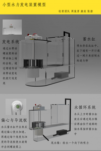 本模型主要应用于教学用途和流体实验,蓄水缸、发电装置、储水缸三位一体,使得在教学演示、实验的过程中操作更加简洁,并且本模型配有水循环系统,实现一次蓄水多次使用,闸口由一片亚克力板来控制水的进停,闸口开启后水通过偏心流入每片成24度角的导流板中,流经尾水锥后进入储水缸后,由水循环系统将水抽回蓄水缸中。本模型利于解决本科阶段只处在理论学习缺乏实际操作的问题,简单易操作,后续配套实验器材丰富,可基本满足不同实验的不同需求。
