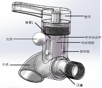 新型水龙头大部分结构采用机械结构,产品主要包括:把手、顶盖、外壳、执行器、销槽、旋转挡板等零件。把手是水龙头中的重要机构,在水龙头的运行过程中起到重要的作用。把手与主体的连接部分出于方便安装的考虑,我们选择使用八菱柱。节水龙头中最主要和核心的结构为执行器,下部分是可以和水管配合的活塞,将水流堵住。中间是杠杆,通过杠杆改变力的方向,从而实现水流力的方向与控制方向的转换。