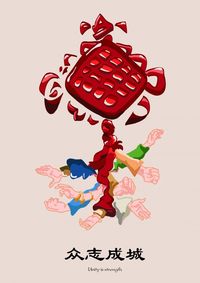 第一张众志成城,由主体中国结,和56个民族的手臂相互交织在一起。中国结是斜着45度方形的,是传统形状的中国结,寓意吉祥,美满。大家的手臂三两成组相互呼应,代表了民族之间的团结精神,有的手握拳有的手掌时候伸开,表示中国还是处于中期呈上阶段,还是需要大家团结努力才能成功。