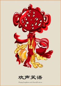第二张欢声笑语,由主体中国结,花鼓,铜锣和麦子共同构成,中国结呈现圆形,象征圆满,也可联想成大饼形状,代表劳动人民的努力劳动最后丰收。整张图片有一种喜庆的感觉。