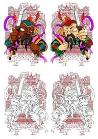 元素来源与”门神“的传统形象,寓意为百姓守住一天的美好。背景为中国传统建筑和未来都市感建筑(赛博朋克风格)结合。意在强调对比,门神饱满的色泽和单线条的背景做出对比、中国传统建筑和赛博朋克风格都市做出对比、中国传统文化和新兴文化做出对比。