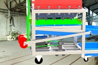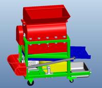板栗脱蓬机,通过全机械解放了农民的双手,大大地提高了生产效率。该机器由电动机驱动,通过皮带的传动,实现主要工作部件辊轮、振动筛、风机的运作,板栗苞经过辊轮的带动、与桶壁的摩擦、自身的摩擦实现板栗拖蓬,脱蓬后的板栗和外苞经过栅笼掉落到振动筛中,振动筛把板栗坚果和板栗蓬分离,板栗坚果和板栗蓬小碎末掉落到下一层振动筛中,上层的板栗蓬和下层的小碎末走到振动筛末端的时候因为重量太轻而被风机吹走,实现了板栗坚果和板栗蓬间的分离。