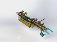 功能与使用说明:这款机器在工作过程中,在拖拉机的驱动下向前方进行,行进轮能够借助限深油缸,对行进轮本身的高度进行调节,而且能够调整开挖铲的实际开挖深度和进入土壤角度。扶秧器扶好秧苗,挖掘铲通过适当角度铲入到土壤中,铲断花生植株的根部,夹持链夹住秧苗,把掘出来的花生秧果被传输到拍土杆,完成清土作业。拍掉土壤后花生秧果进入往摘果箱,将花生果实和秧苗分离,花生果掉落至传送带上,将花生传动到振动筛上,实现筛选目的,少部分未拍除的沙土随后从振动筛的底部端掉落地面,花生果实收入袋中,晾晒干制后再进行加工生产。