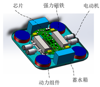 2)结构设计:擦窗机器人有正副两个,副机跟随主机运动。在每个机器人内部都有两个蓄水箱,强力磁铁,处理器,锂电池.如图2.3,在机器人外部通过橡胶履带牵引机器人运动,如图2.4所示;