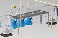 产品的结构主要包括上料传送带、四台搬运机、刷洗机械臂、打磨机械臂、抛光机械臂、退料传送带和PLC控制系统等相关部件。整套装置在PLC的控制下运行,确保了运行过程的可靠性。