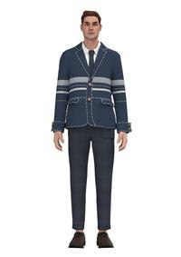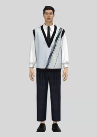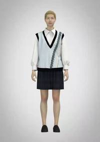 本作品灵感来源于曾经的雾都—伦敦。作品中采用格子元素再显英伦风格,色调以蓝色为主,表现浓雾细雨下伦敦的凛冽。采用条纹装饰,从格子中提取出线条和斜纹条带重新组合,破坏单色面料的单调感。作品的轻熟感适合出入职场的大学生,逐步从学生开始到社会人士的过度。