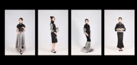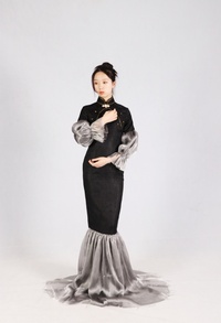 旗袍是具有浓厚东方特色的一个代表,能够表现出中华女性贤淑、典雅、温柔、清丽的 性情与气质,更能凸显女性的身体曲线。本系列将晚礼服元素融入旗袍当中,并且在选材上进行多重实验,最终把织锦缎作为主面料,辅料选用冰阳花离子闪光绉纱。织锦缎面料能够使得本系列服装表面光亮细腻、手感丰厚,闪光绉纱布料轻薄,光泽度强,与其拼接使服装更具视觉效应。