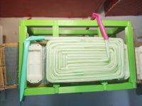 锌合金浇铸生产线目前生产流程:高温锌合金液经浇铸到模具后,迅速扒渣,在结晶冷却过程中,主要采取直接冲水、人工洒水和风机吹的方式使工业用水洒在铸锭上,水在高温下沸腾并汽化,工业风机将水汽和热量吹散至空气环境中加速设备锈蚀,造成大量热量散失,使得车间工作环境温度达长期处于38℃以上,恶化了工人生产环境和设备运行环境。