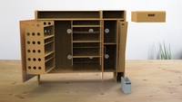 在南方多雨的季节里,回到家鞋子和雨伞总是湿漉漉的,会导致家里有各种各样的积水,面对这种情况,我们团队研发出了智能多功能鞋柜。该鞋柜主要由三个部分组成,鞋子烘干部分,长雨伞烘干部分,折叠雨伞烘干部分。鞋子烘干部分采用了斜向对称结构,共计10层,每一层采用了对立60度斜向放置,在相同的空间里放置更多的鞋子,合理化的设计使得在取用鞋子时可以将鞋架整体取出,活动的结构使得每一层的空间都可以自由分配,让不同大小的鞋子都有安家之所。臭氧杀菌消毒器的应用使得杀菌更为的方便,无叶风扇烘干电热机的使用让产品工作没有噪音。长雨伞烘干部分采用活动板块结构,按压可部分抽出,也可全部抽出,分体式设计可以容纳不同大小的长雨伞,也可以避免干雨伞和湿雨伞混在一起。