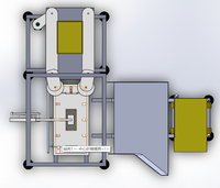 自动化折箱机的运作,只需将原料纸板放入最右侧的进料处,随后原料纸板会被运动的滚轮一张张送出进料处进入纸箱折叠区域。中心模具四个最高齿的顶端放置特质纸板,后由滚轮提供动力,由传动杆带动着下压柱向下运动,下压柱上端初步接触纸板,完成纸板的初步变形。然后下压柱后方向下延伸的圆柱体将 压迫位于中心模具后滑槽轨道内的下拉滑块,下压滑块随着下压柱的持续下降也将向下运动,同时带动着下拉装置,使翻折柱向内运动完成纸壳箱侧边的翻折过程。等下压柱下压到最低点时翻折柱的向内旋转角度也达到最大,随着滚轮运动了半圈后,下压柱将往上抬升,由于下压滑块底部加有弹簧,所以下拉滑块也会随着下压柱向上运动,同时翻折柱也将随着下拉滑块的上升而复位,而下端的支撑装装置将会持续上升,把成型的纸壳箱顶出中心模具,成型后的纸箱随后会被传送带送离机体,自动化折箱机的全部工作程序完成。